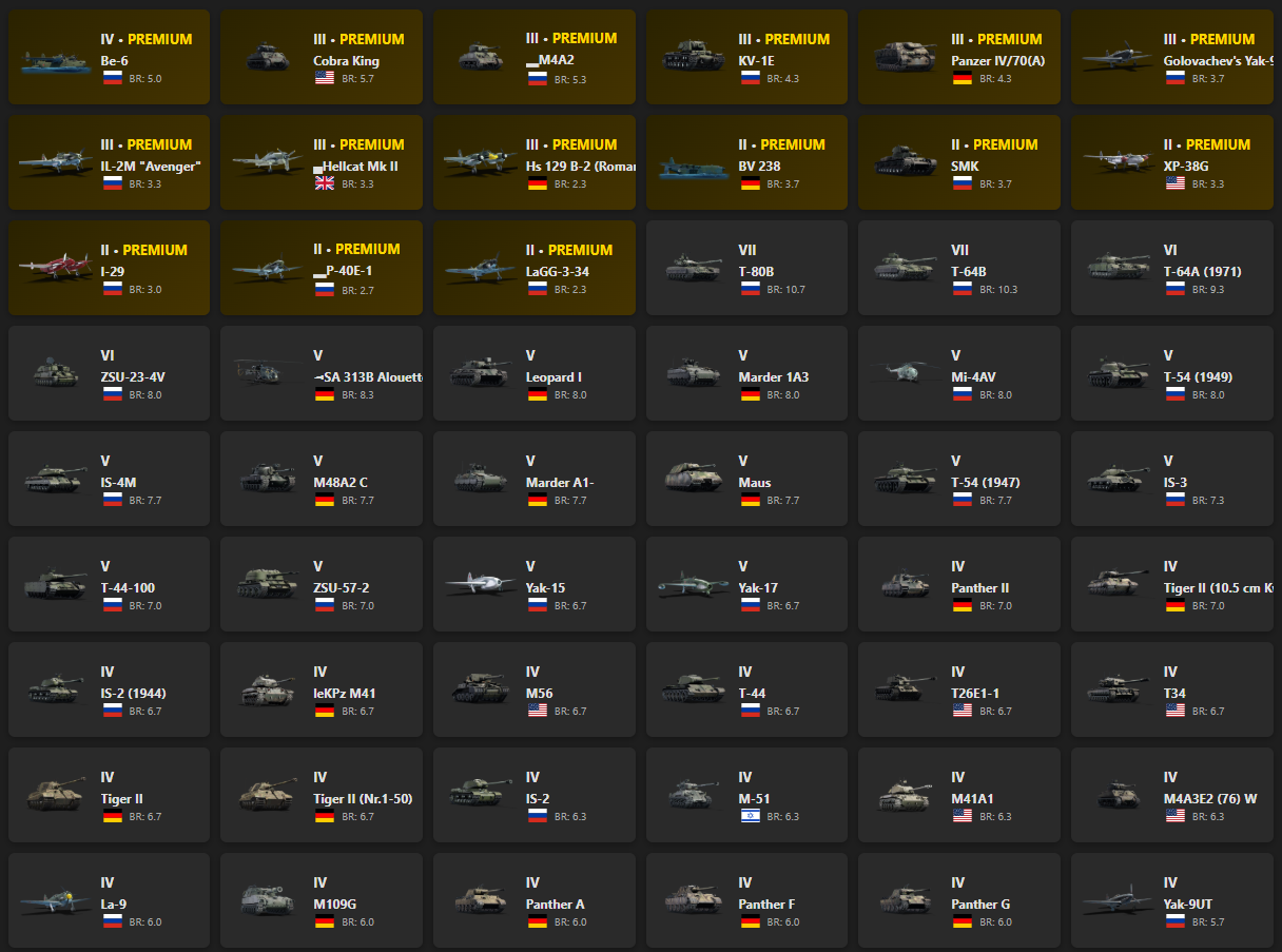 VII - 2, VI - 2 Cobra King, T-80B, T-64B, T-64A (1971), ZSU-23-4V, Panther II, Tiger II (10.5 cm Kw.K), Maus