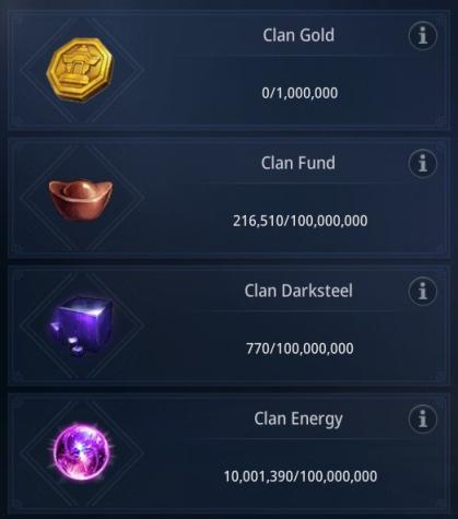 Имеются ресурсы клан в количестве: 216 510 капитал клана, 770 темной стали клана,10 001 390 энергии клана.