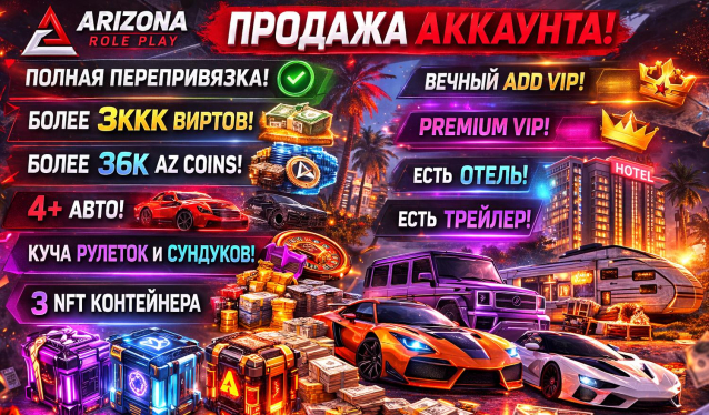 Больше 3ккк виртов (больше 2кк в депозите, остальное на счету и в налике), есть железная карта нацбанка, отель, трейлер, больше 36к аз коинов, 3 нфт контейнера, больше 500 бронзовых рулеток, больше 700 платиновых, больше 5 талонов на х4 пей дей (не передаваемых), ADD VIP FOREVER, PREMIUM VIP, много улучшений персонажа и куча всего еще.