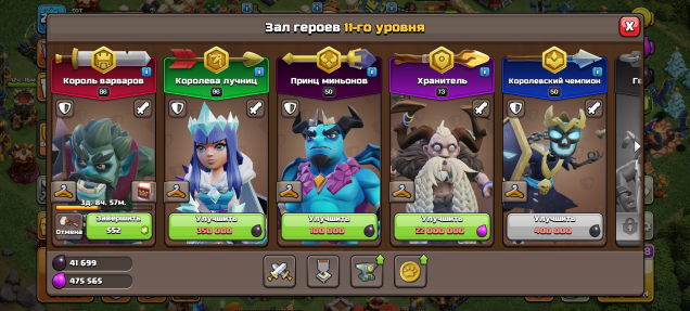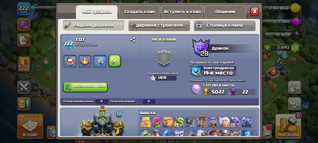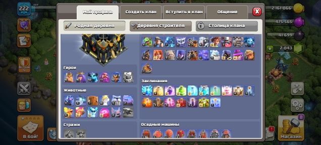 Уровень Ратуши: 17Краткое описание: Уровень: 222 🔝 герои: 86/96/50/73/50 👑 СНАРЯЖЕНИЕ: 🔝 Д/С: FULL 9 🏰 БЕЗ ПАССАЖИРОВ ✅