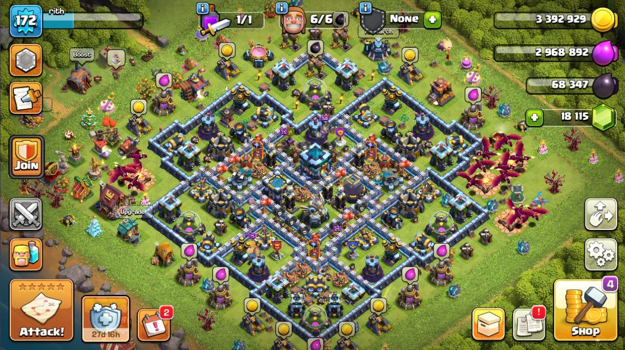 Уровень Ратуши: 13Краткое описание: 13 тх 90% фулл, 55/72/40/50/19, 399 лвк, 18 к гемов, описание👇