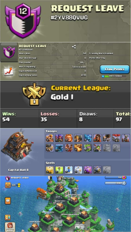 Краткое описание: REQUEST LEAVE | LEVEL 12 CLAN | GOLD 1 CWL LEAGUE | CLAN CAPITAL 8 | WIN 54 | LOSE 35