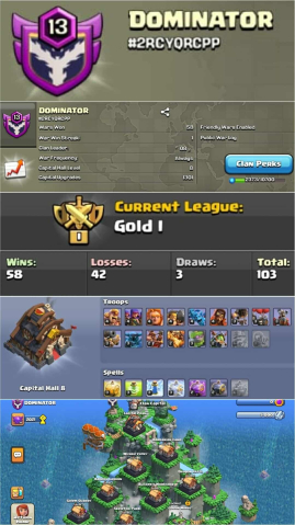 Краткое описание: DOMINATOR | LEVEL 13 CLAN | GOLD 1 CWL LEAGUE | CLAN CAPITAL 8 | WIN 58 | LOSE 42