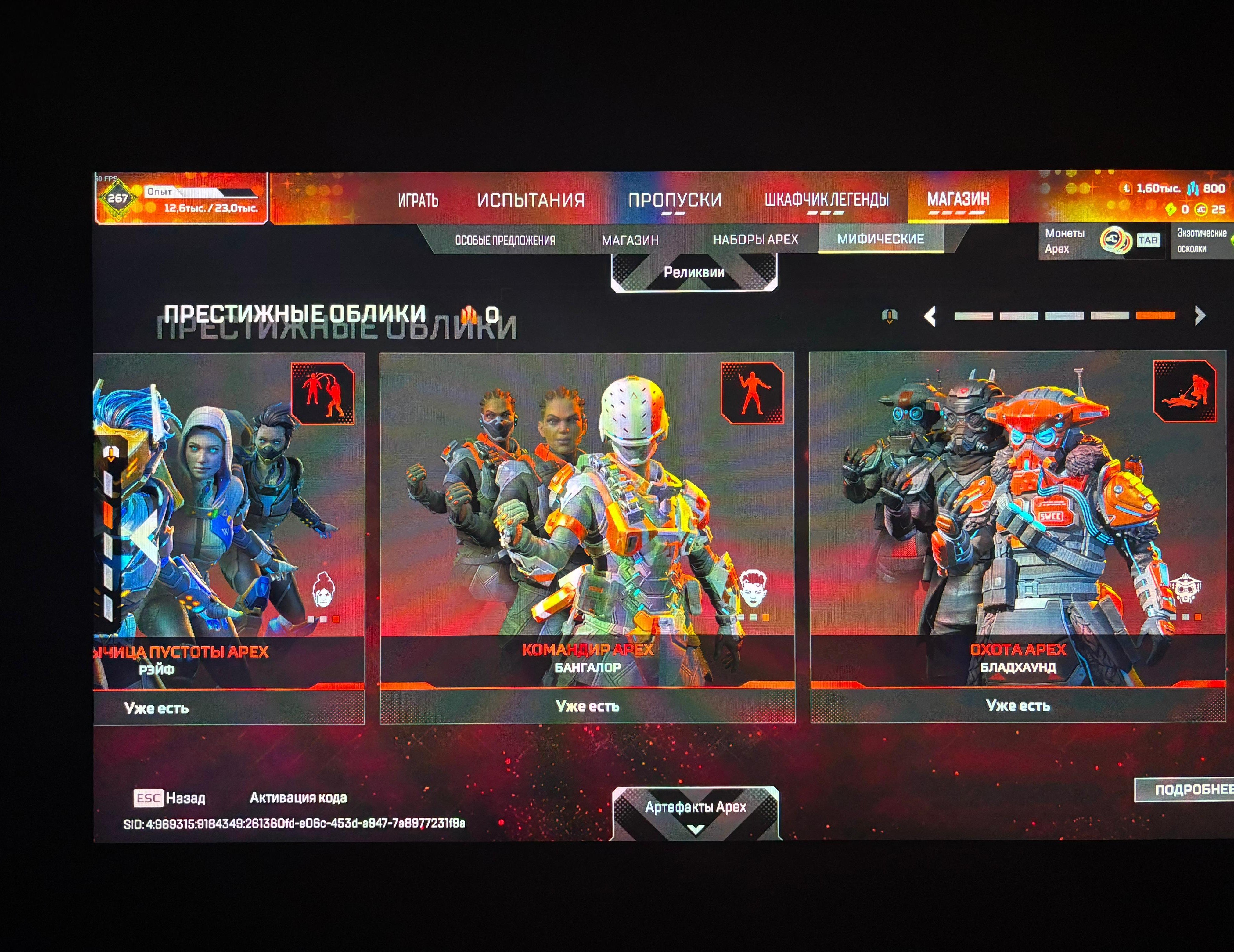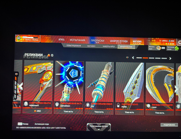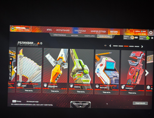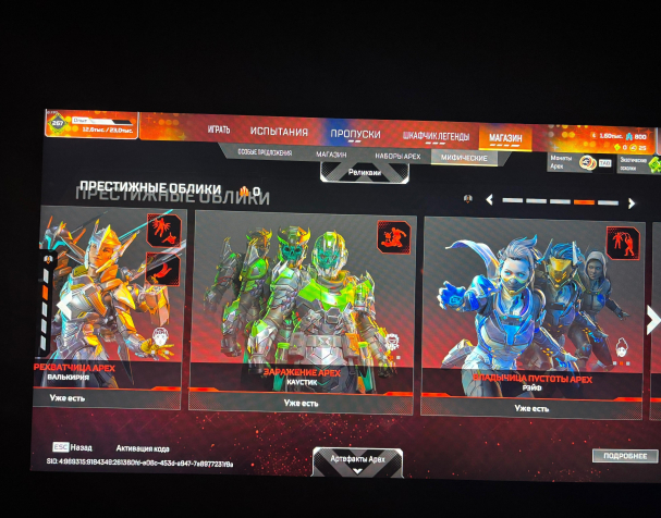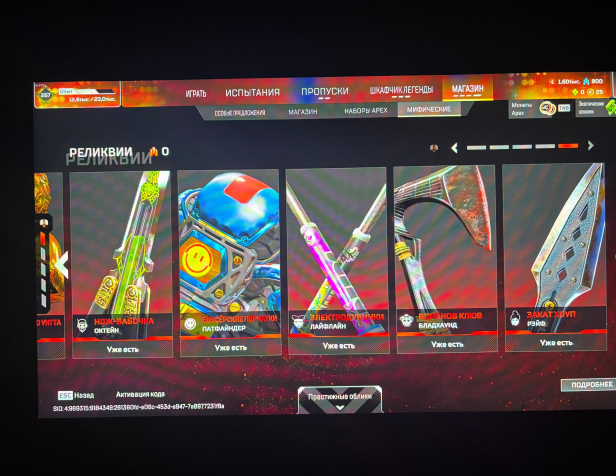 У всех легенд кроме фьюза есть реликвия, из реколоров реликвий есть только кунай рэйф, престижные облики есть у 5 легенд, бладхаунд, бангалор, рэйф, каустик, валькирия. 500+ легендарных скинов на легенд, оружие, баннеры, рамки и т.д.