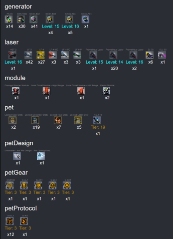 23 ПРОМЕТЕЕВ (14-16 LVL) + 9 B03 (15-16 LVL) + 1 SG3N-P01 + 36 LF4