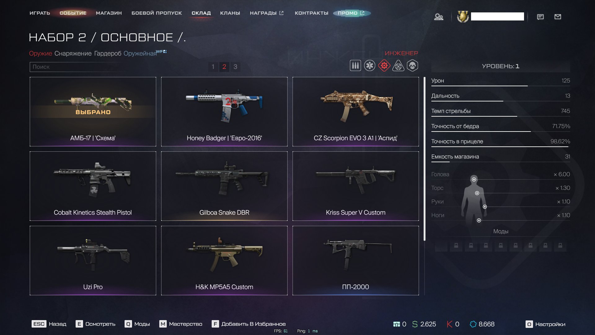 ☑️Инженер -АМБ-17 «Схема»( 1 ур ), CZ Scorpion EVO 3 A1 «Аспид»( 5 ур ), Honey Badger «Евро-2016»( 5 ур)