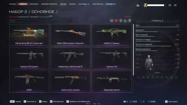 ☑️Медик -Marlin 1894 Custom «Капитал»( 1 ур ), Panzer Arms BP-12 «Стрит-арт»( 1 ур ), USAS-12 «Камыш»( 1 ур)