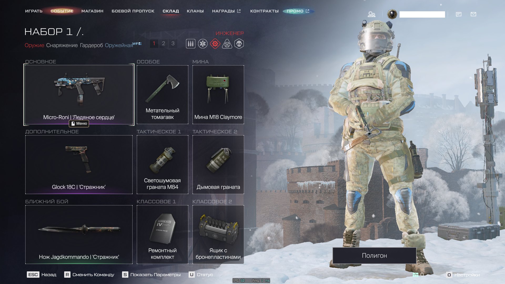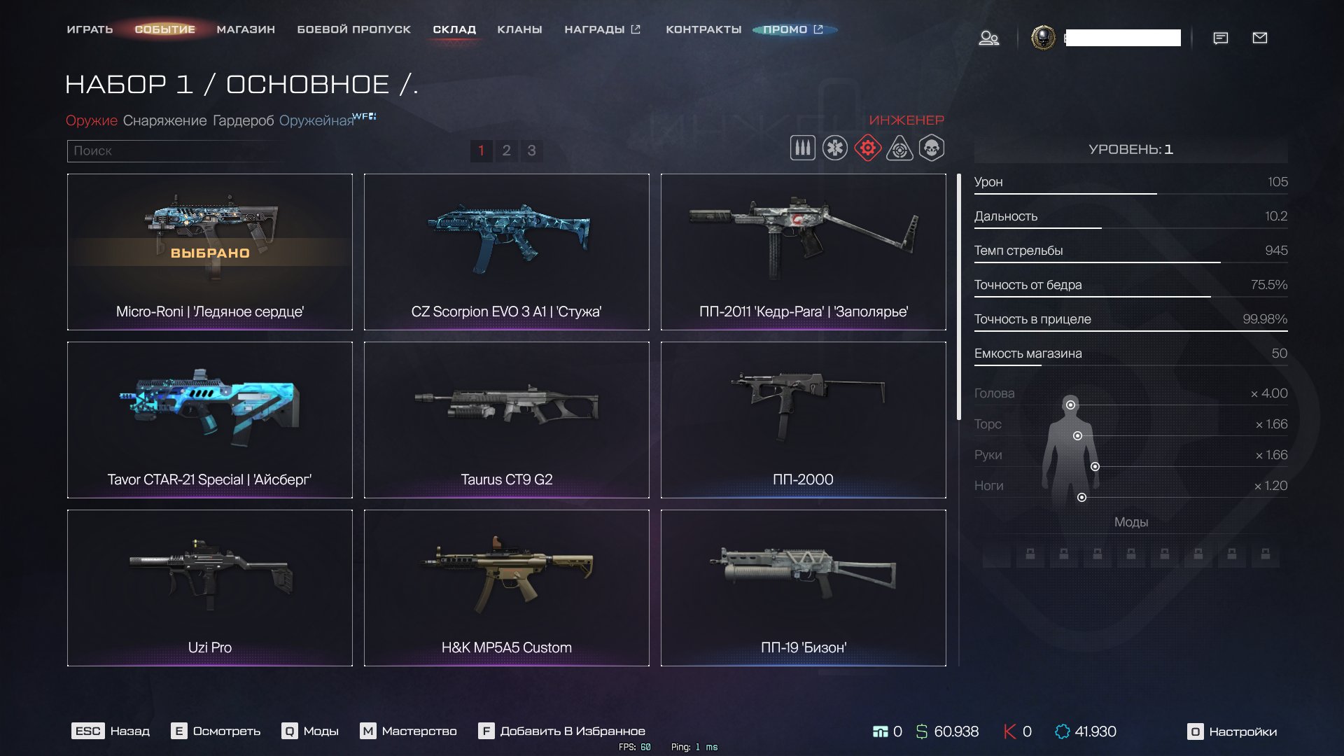 ♦️Инженер — Micro-Roni «Ледяное сердце»( 1 ур ), CZ Scorpion EVO 3 A1 «Стужа»( 25 ур ), ПП-2011 «Кедр-Para» «Заполярье»( 19 ур ), Tavor CTAR‐21 Special «Айсберг» ( 1 ур )