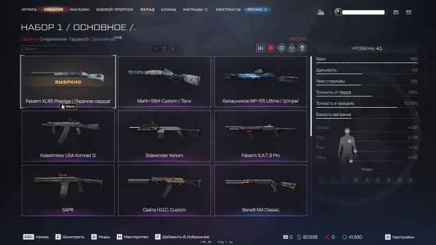 ♦️Медик — Fabarm XLR5 Prestige «Ледяное сердце»( 41 ур ), Marlin 1894 Custom «Тень»( 24 ур ), Калашников MP-155 Ultima «Шторм»( 46 ур )