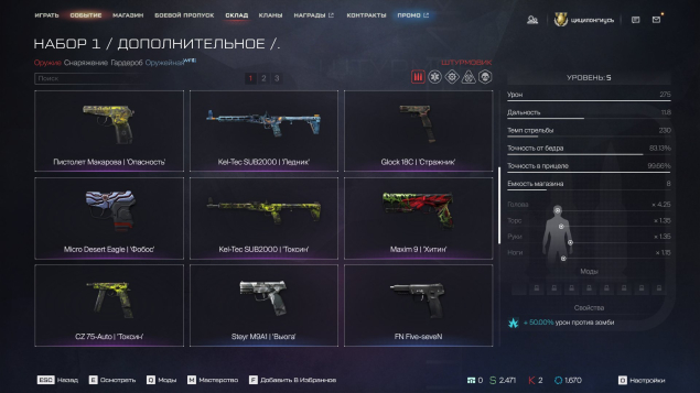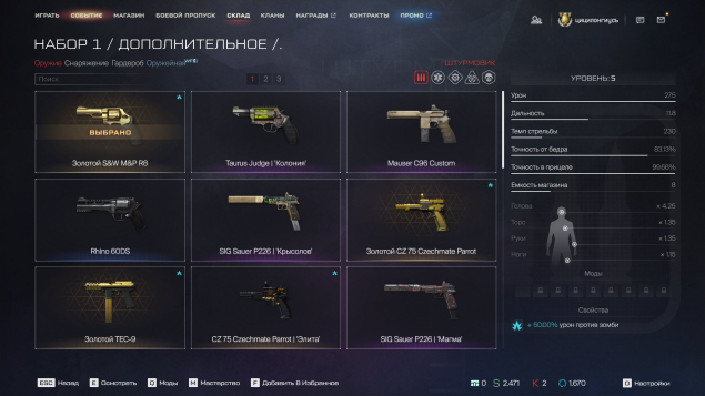 Пистоли: золотой R8 (актуальный, еще в сервисах 2 золотых ), Золотой Дигл,Taurus Judge ,Mauser, Sig Sauer p226 крысолов, магма, Макаров, Glock 18C страж. внешность оборотни на все классыПо остальным вопросам в лс ))