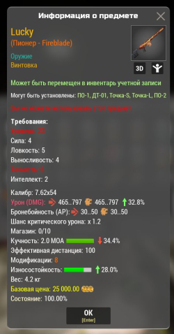 Сервер: RU-7Краткое описание: Пионер — Fireblade м8 32.8% урон -34 кучность +28 износ (любой сервер)