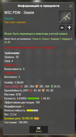 Сервер: RU-2Краткое описание: WSC PDW — земля м8 (281-454) 33.5% урон -45 кучность 0 износ (любой сервер)