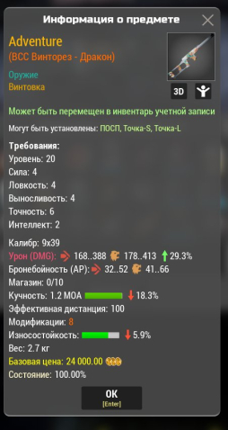 Сервер: RU-1Краткое описание: ВСС Винторез дракон м8 29.3% урон -18 кучность -5 износ (любой сервер)