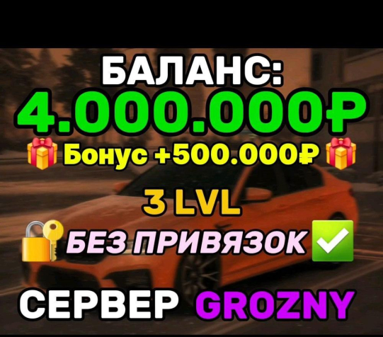 ⚡️ ПОЛНЫЙ ДОСТУП ⚡️ БАЛАНС: 4.000.000₽ ⚡️ + ⚡️ 500.000₽ ⚡️ ⚡️ БЕЗ ПРИВЯЗОК ⚡️ ⚡️ 3 lvl ⚡️ GROZNY ⚡️ СМОТРИТЕ ОПИСАНИЕ ⚡️Уровень: 3