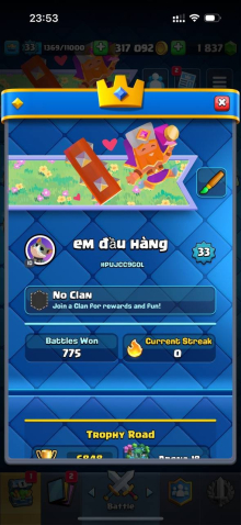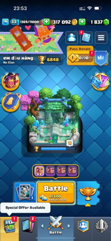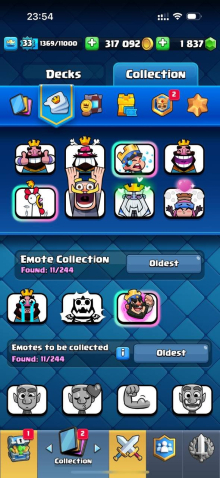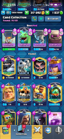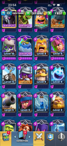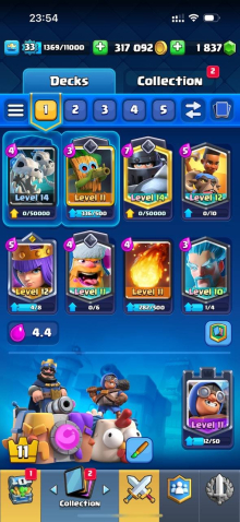 Краткое описание: 6.8 к кубков, 33 лвл, 2 карты 14 лвл, колода с мегарыцарем, 3 эво, 317 к монет, описание