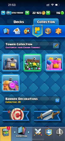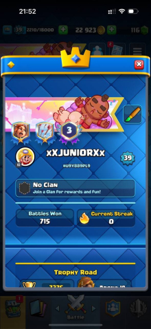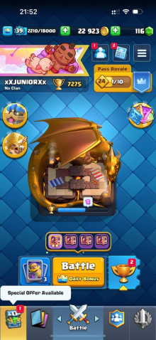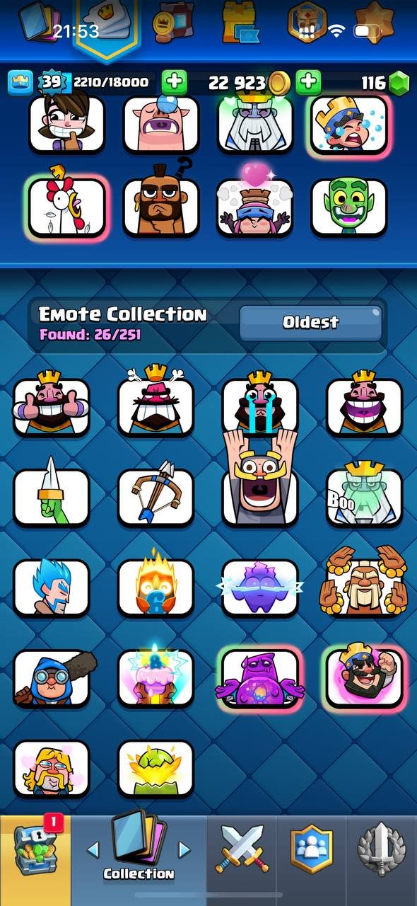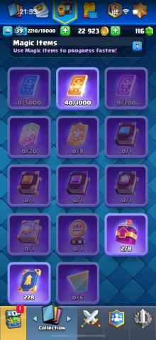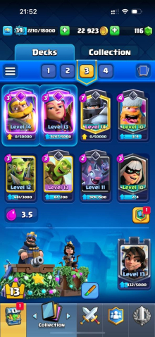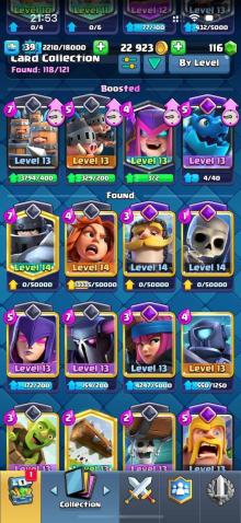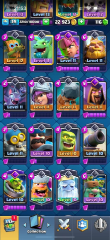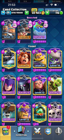 Краткое описание: 7.2 к кубков, 39 лвл, колода с рыцарем, 8 эволюций, 26 эмодзи, читай описание