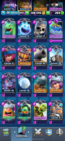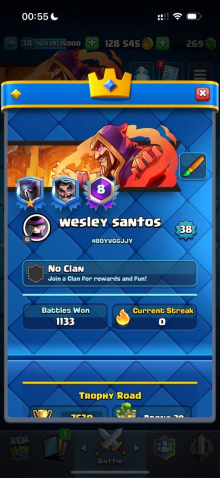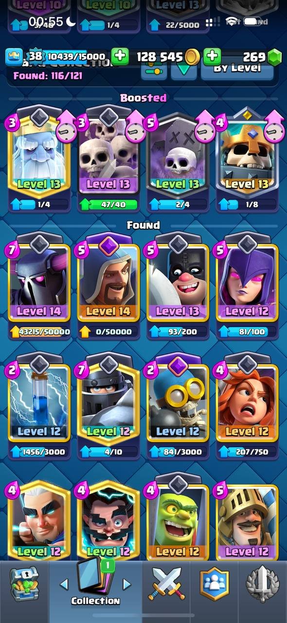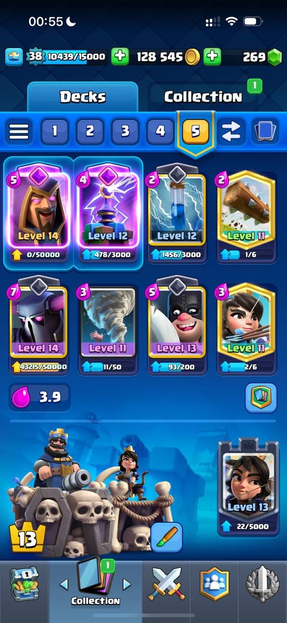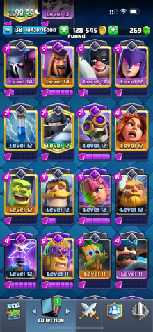 Краткое описание: 7.5 к кубков, 38 лвл, колода с пеккой, 128 к монет, 6 эволюций, 23 эмодзи, читай описание