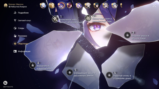 — Персонажи на аккаунте: Кастория е2, Ахерон е2, Анакса Трибби, Гиацина, Светлячок, Цзяоцю, Топаз и Счетовод, Жуань Мэй, Цзинлю, Аглая, Кафка, Чёрный Лебедь, Фэйсяо, Блэйд e1, Воскресенье, Лоча, Фаенон, Зарянка, Авантюрин, Доктор Рацио, Арчер, Броня е3, Вельт е3, Клара е5, Гепард, Химеко е2, Байлу е1, Зеле.