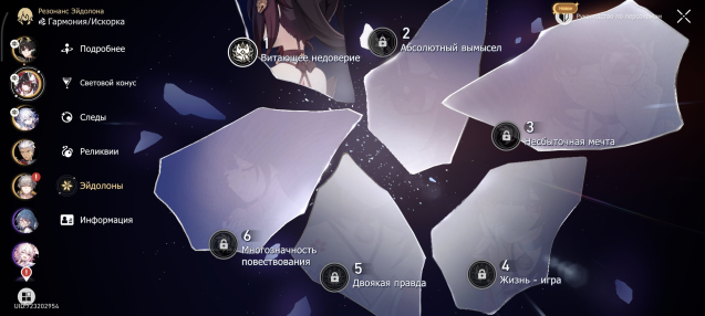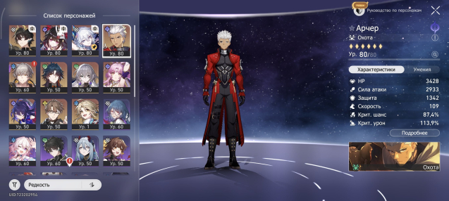 Подробное описание: Аккаунт с невероятно прокачанным(нет) отрядом Арчера с 1м эйдолоном и сигной(вау). В бонус идёт немыслимая Яо Гуан с 1м эйдолоном и сигной(вау) а также Искорка с 1м эйдолоном и сигной(вау, вау). Из остальных идут Зеле, Броня, Блейд, Фу Сюань и Вельт. Золотой дух попутчика на месте.