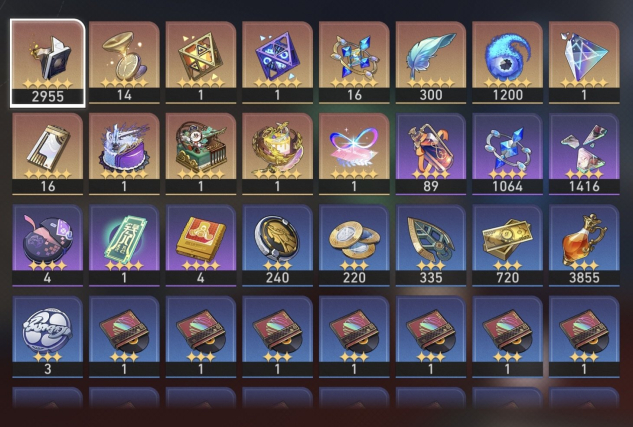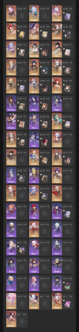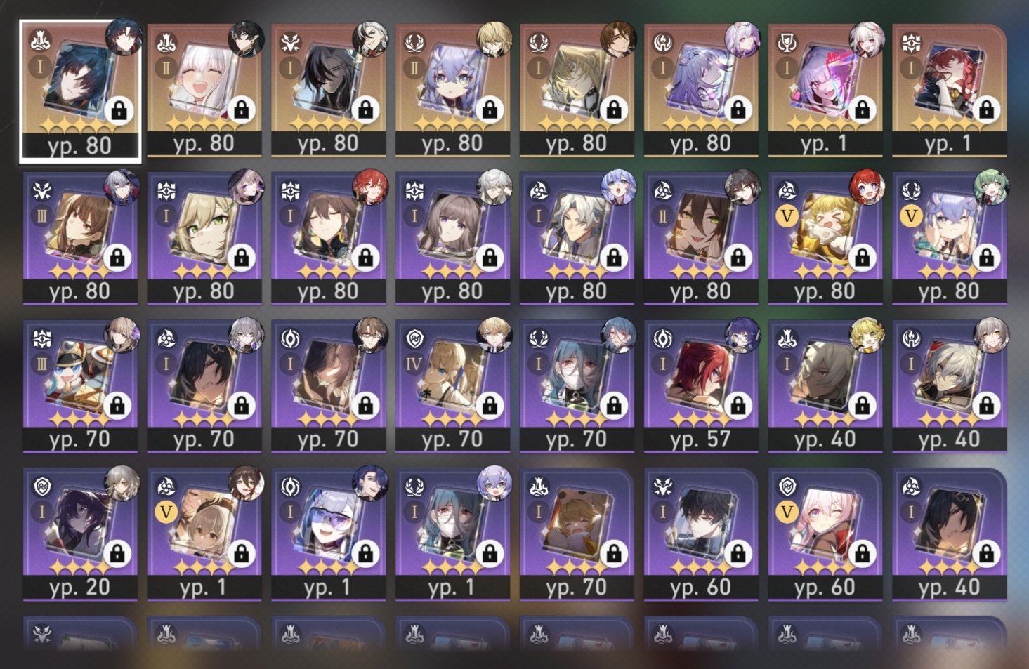 На аккаунте имеются ивентовые 5☆ персонажи: Искра + сигна, Искорка, Яо Гуан, Дань Хэн: Освободитель Пустошей, Кастория + сигна, Зарянка е1, Трибби, Бутхилл + сигна, Кирена, Великая Герта, Темень, Керидра, Арчер, Жуань Мэй, Дань Хэн: Пожиратель Луны е1, Цзин Юань, Лоча + сигна, Хохо, Топаз, Цзяоцю и Броня е4