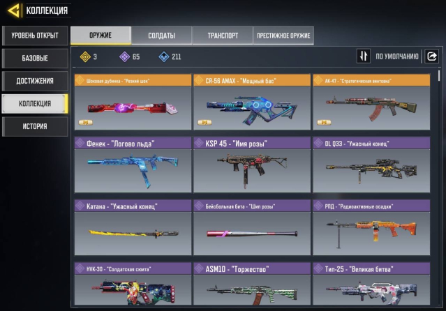 🍊 ОРУЖИЕ: 3 ЛЕГЕНДАРНЫХ; 65 ЭПИК, 211 РЕДКИЙ
