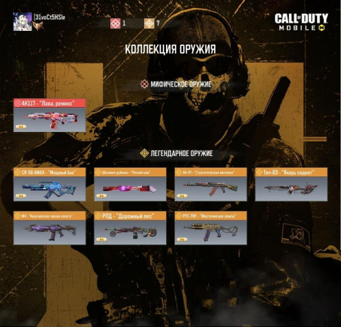 📌 На аккаунте имеется: 1-н миф оружие, и 7-мь лег оружий.
