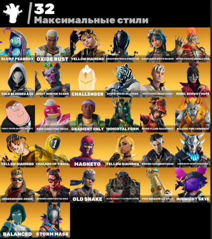😂 Memes & Hype: 🍺 Peter Griffin (Питер Гриффин): Главный папочка из Гриффинов! Тот самый мемный скин, который все хотят. В комплекте с фирменными эмоциями. 🍌 Peelverine (Пилверин): Банан-Росомаха. Смешной и популярный.