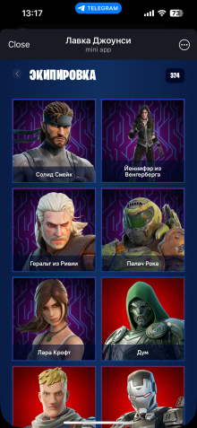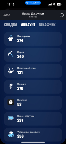 На аккаунте есть старый формат STW с фармом v-баксов, 374 скина разной редкости, много обликов категории селебрити, а так же редкие скины по типу minty, скинов от nvidia, арахниды глоу и прочие ребята, полный список вышлю в личку при желании.