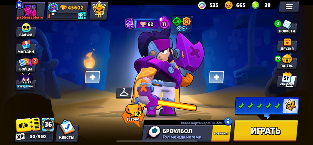 • 𝟔𝟔𝟓 монет 💰 / 𝟑𝟗 гемов 💎 / 𝟓𝟑𝟓 блингов 🎟️ / 𝟒𝟒𝟖𝟔 очков силы 🌟
