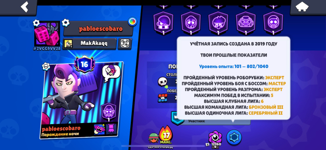 📅 Создан в 𝟐𝟎𝟏𝟗 | 🔥 𝟐𝟎𝟗 скинов | 💪 𝟗𝟗/𝟏𝟎𝟎 бравлеров (𝟐𝟑 на 11-й силе)
