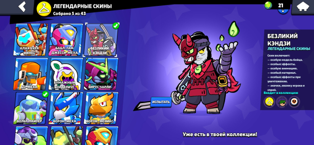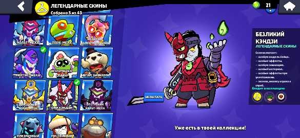 На аккаунте присутствует 5 легендарных скинов, 11 мифических, множество эпически, редких, обычных скинов.