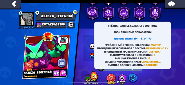 📅 Создан в 𝟐𝟎𝟐𝟏 | 🔥 𝟐𝟔𝟓 скинов | 💪 𝟗𝟗/𝟏𝟎𝟎 бравлеров (𝟐𝟖 на 11-й силе)