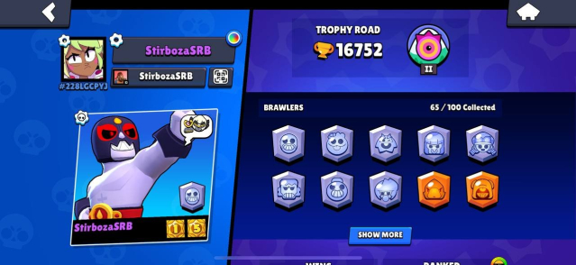 Краткое описание: 16 к🏆, 65 бравлеров, 5 лег, 3.5 к блингов, 60+ скинов, описание👇