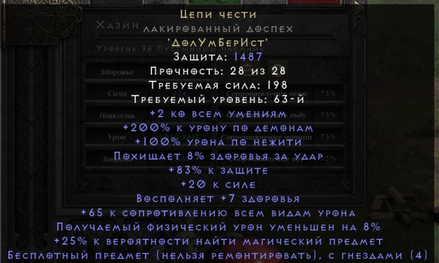 Ее можно одеть мерку Новы Сорки вместо Fortitude (Силы Духа), потому что в топовой болванке он ее не сможет носить, без Лика Андариель, которая дает ему +30 силы. Такой мерк носит Cure (Лечение или Лекарство) и Insight (Прозрение) для бафа сорки. Такая Сорка носит Infinity (Бесконечность) в своих руках.