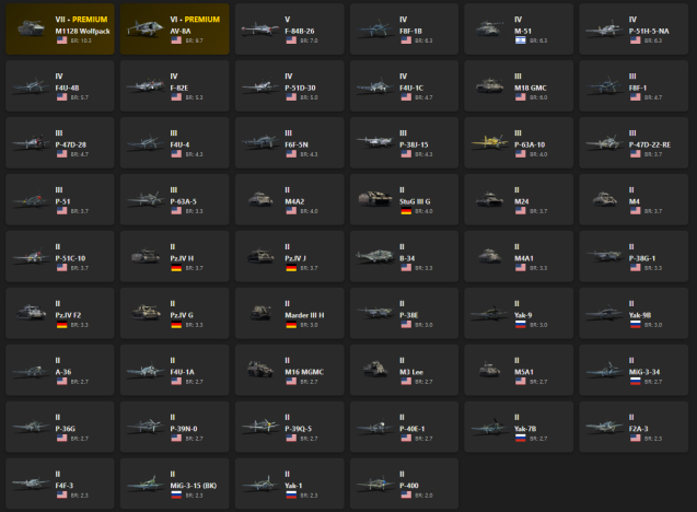 VII - 1, VI - 1 M1128 Wolfpack, AV-8A, F-84B-26, F8F-1B, M-51, P-51H-5-NA, F4U-4B, F-82E, P-51D-30, F4U-1C