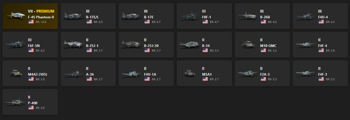 VII - 1 F-4S Phantom II, B-17E/L, B-17E, F8F-1, B-26B, F4U-4, F6F-5N, B-25J-1, B-25J-20, B-34, M10 GMC