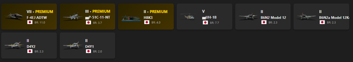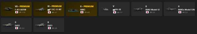 VII - 1, V - 1 F-4EJ ADTW, P-51C-11-NT, H8K3, UH-1B, B6N2 Model 12, B6N2a Model 12Ko, D4Y2