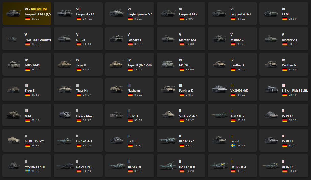 VII - 1, VI - 5 Leopard A1A1 (L/44), Leopard 2A4, Begleitpanzer 57, Leopard 1A5, Leopard A1A1, TAM, DF105