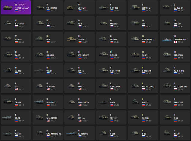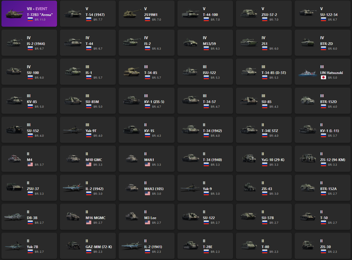 VII - 1, V - 5 T-72B3 "Arena", T-54 (1947), 2S19M1, T-44-100, ZSU-57-2, SU-122-54, IS-2 (1944), T-44, IS-2
