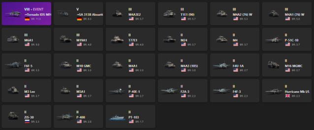 VIII - 1, V - 1 Tornado IDS MFG, SA 313B Alouette II, M4A3E2, T1E1 (90), M4A2 (76) W, M4A1 (76) W, T77E1