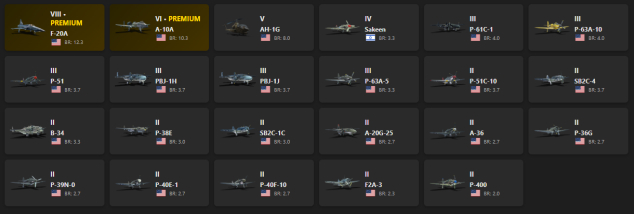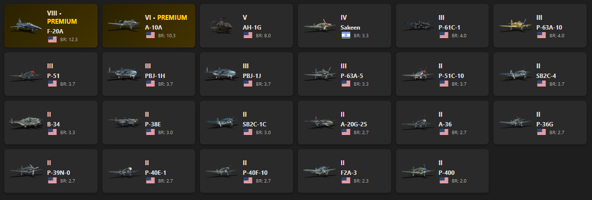 VIII - 1, VI - 1, V - 1 F-20A, A-10A, AH-1G, Sakeen, P-61C-1, P-63A-10, P-51, PBJ-1H, PBJ-1J, P-63A-5, P-51C-10