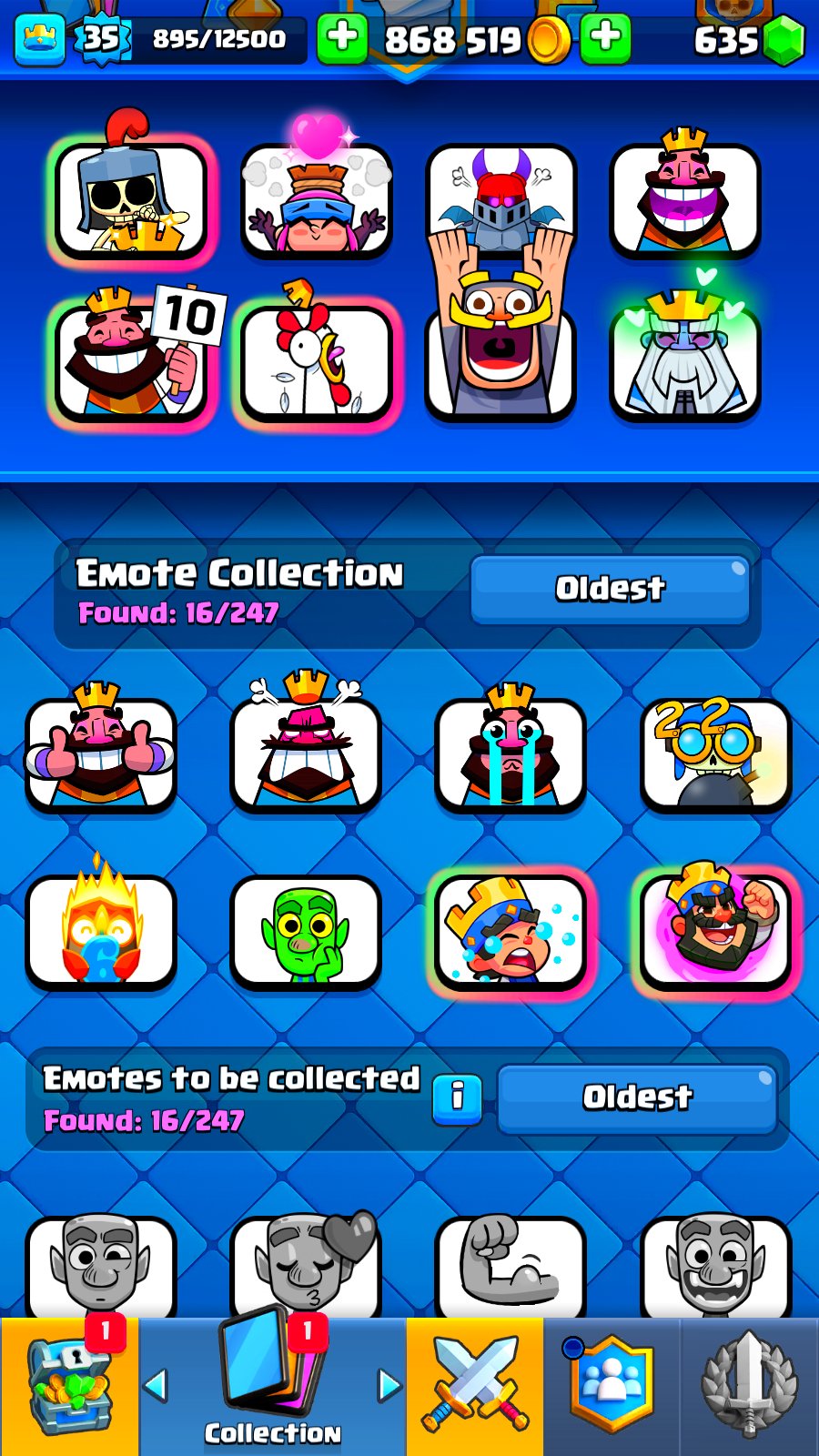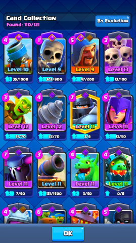 🔳 Открыты легендарки, прокачаны ключевые карты, есть много крутых эмоций и скинов 🎉