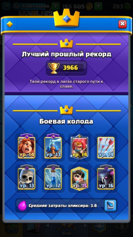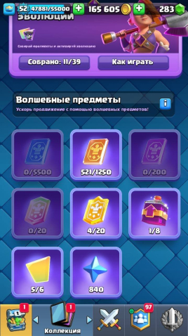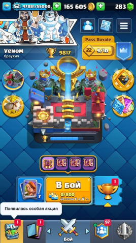 Подробное описание: 🏆 Кубков: 9817 📝 Карт: 121/121 ❤️24 Арена 💯14 Уровень Короля 💥52 Уровень 💚283 Гема