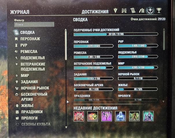 Все крафты/гильдии/ремесла прокачено на максимум. Пройдены многие данжи и триалы на Оболочки и Ачивки.