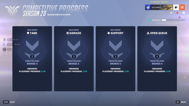 Rank: Triple Bronze (Assailant: Bronze 3, Tank: Bronze 3, Support: Bronze 3,Dps openQ 4 )