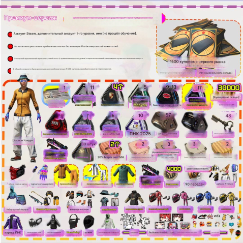 Краткое описание: 🎫 1600 КУПОНОВ | 🆔 1 КАРТА СМЕНЫ НИКА | 📦 150+ ЯЩИКОВ | 👕 ELITE SETS