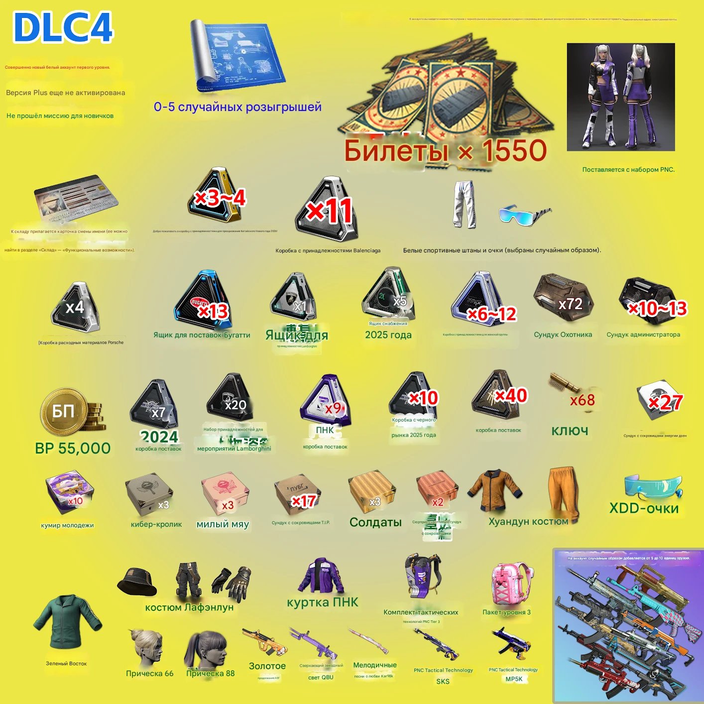 🎒 Снаряжение: Прическа 66, прическа 88 и 5-10 случайных скинов на оружие.