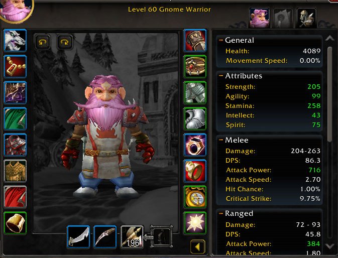 Краткое описание: Warrior 60 lvl; Male gnome, Skinning/Mining 300, 60% mount, Dual spec.