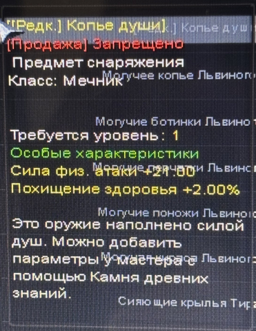 Сервер: Азмара-БлэкФорестКраткое описание: Редкое Копьё души физ атака +21 поглот Оз 2%
