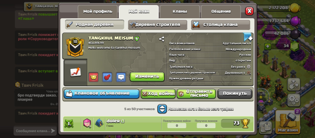 Краткое описание: Продаётся клан ⚔️ 🏰 Уровень клана: 18 🏆 столица: III ⚔️ Лига войн кланов: Хрусалная 2 Пиши в ЛС 💬